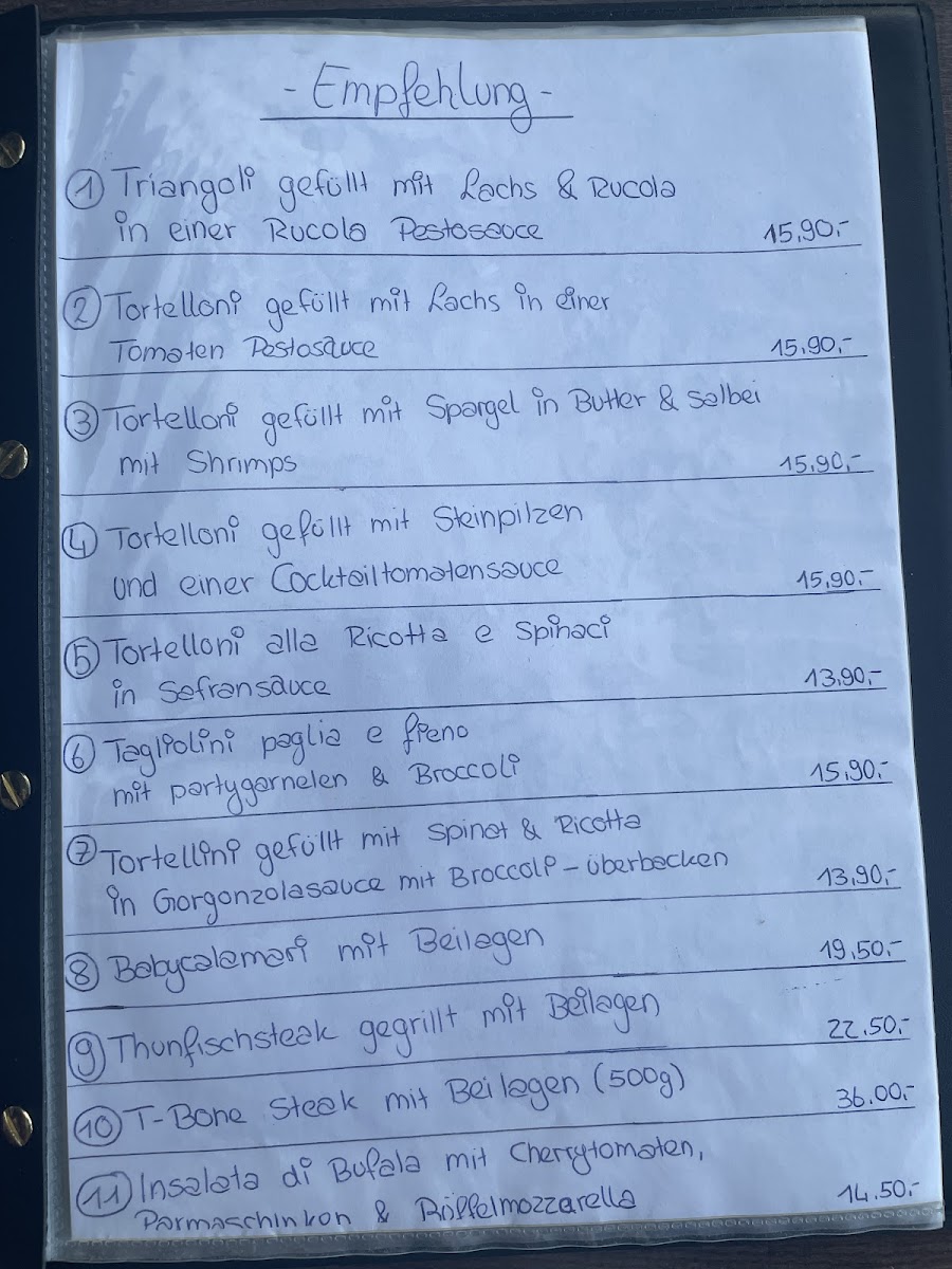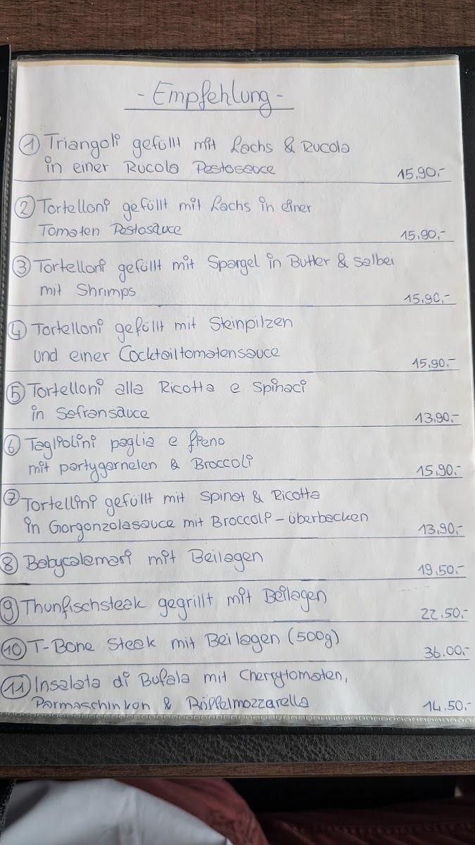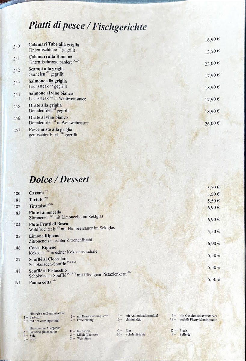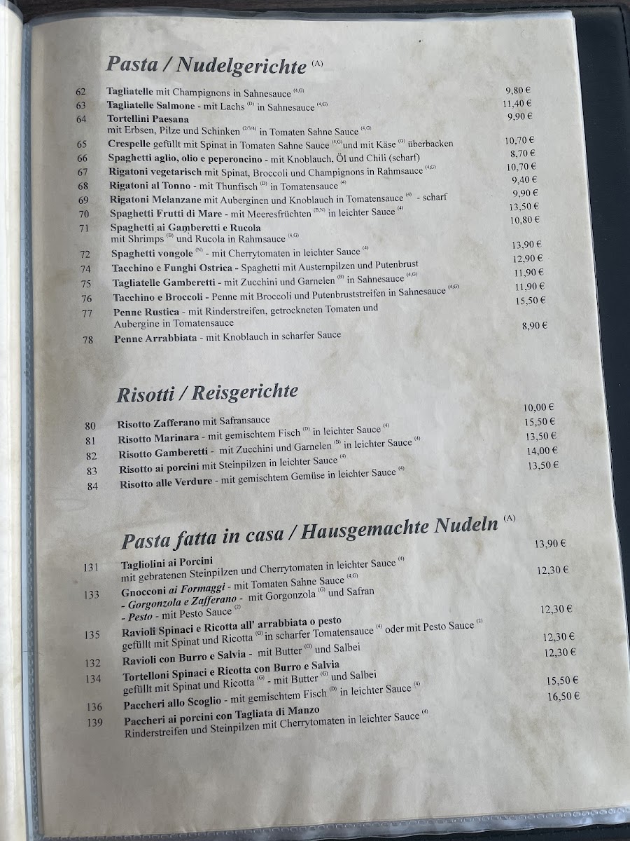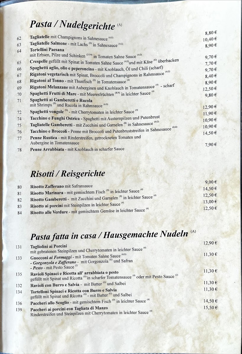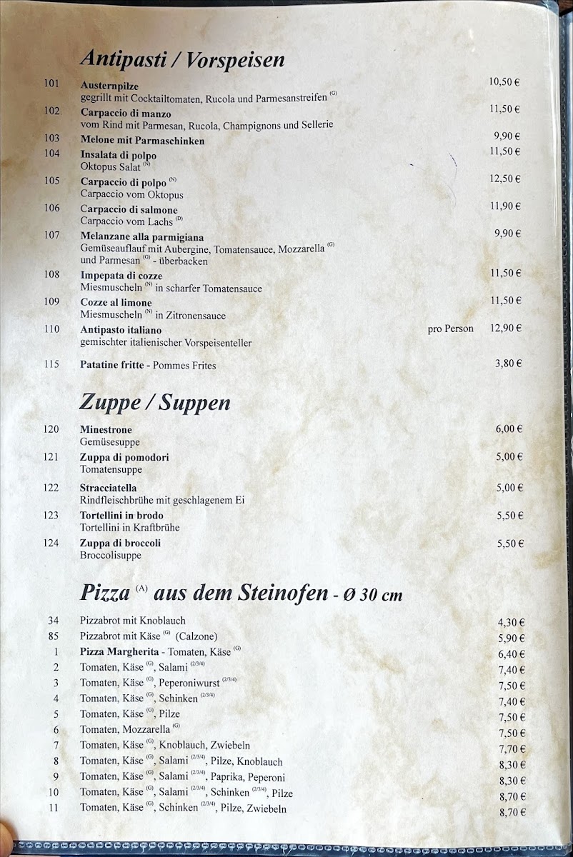 For appetizers, the menu features a selection of Carpaccio, including Carpaccio Di Manzo, Carpaccio Di Polpo, and Carpaccio Di Salmone, perfect for those who enjoy delicate flavors. There's also the refreshing Melone Mit Parmaschinken (melon with Parma ham) and the unique Insalata Di Polpo (octopus salad), offering a taste of the sea.
