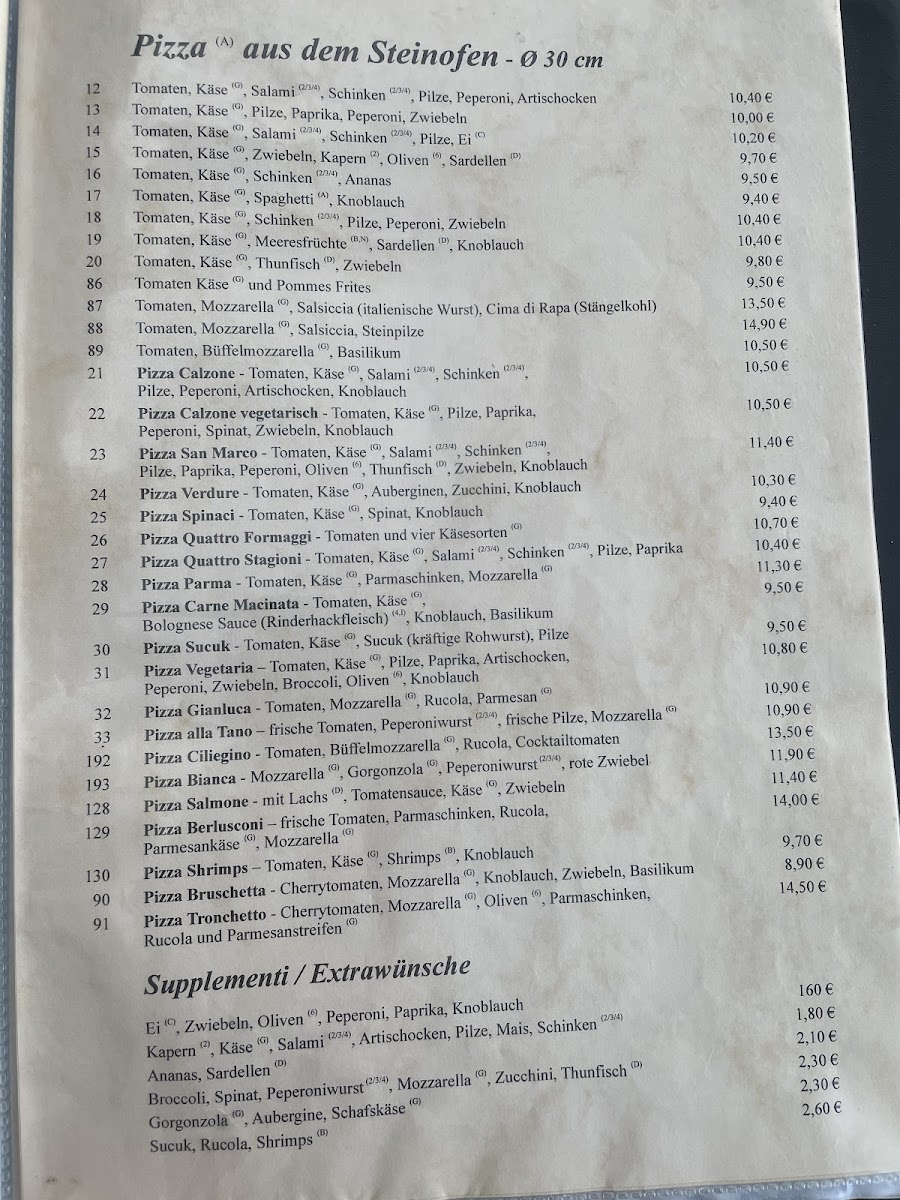 The menu at Pizzeria San Marco in Eschborn offers a delightful variety of Italian dishes, with options ranging from soups and salads to hearty pizzas, pastas, and meat specialties. Starting with the Soups, customers can enjoy flavorful choices such as the classic Minestrone, Zuppa Di Pomodori, and the creamy Stracciatella Tortellini In Brodo, as well as Zuppa Di Broccoli for a lighter option.